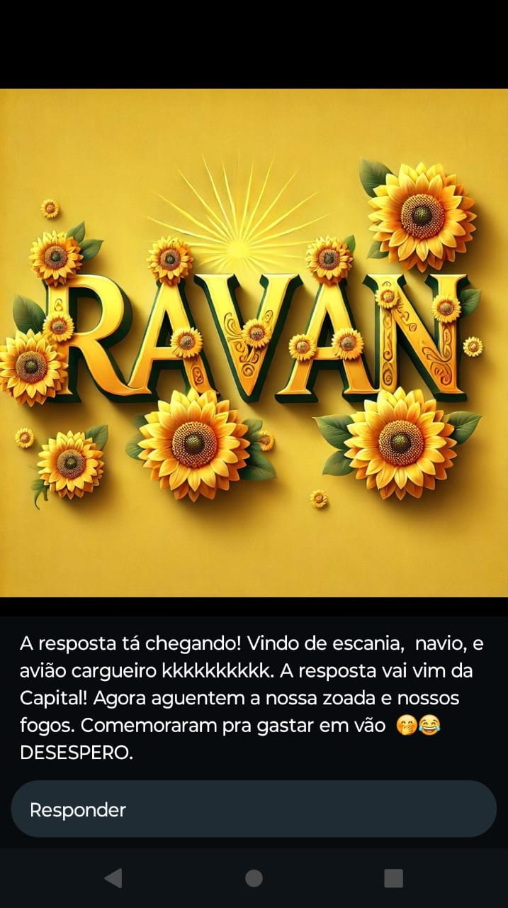 "A resposta tá chegando! Vindo de scania, navio e avião cargueiro. A resposta vai vir da capital! Agora aguentem a nossa zoada e nossos fogos. Comemoraram para gastar em vão. Desespero”, disse Ravan na publicação enviada por fontes ao BNews.