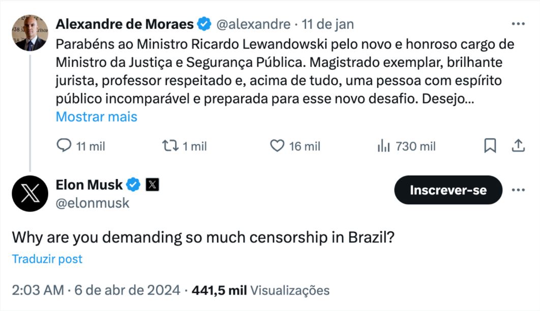 O dono do X (antigo Twitter) Elon Musk perguntou na madrugada deste sábado (6) por que o ministro do Supremo Tribunal Federal (STF), Alexandre de Moraes, “exige tanta censura no Brasil”. O questionamento foi feito em uma publicação no X de 11 de janeiro, em que Moraes parabeniza o ex-membro da Corte Ricardo Lewandowski pelo cargo de ministro da Justiça e Segurança Pública.