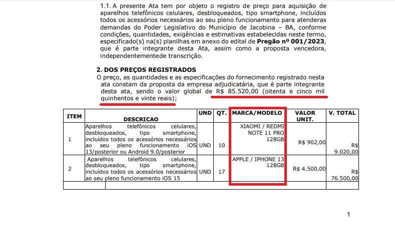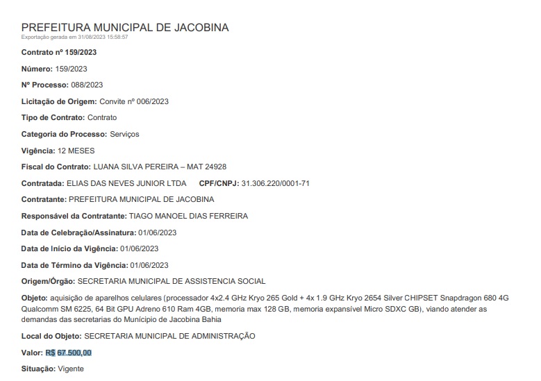 A Prefeitura de Jacobina também realizou uma compra de alta de aparelhos celulares recentemente. Em publicação no Diário Oficial do Município, na parte de contratos, consta um contrato no valor de R$ 67.500,00 com a empresa ELIAS DAS NEVES JUNIOR LTDA, de nome fantasia JR IMPORTS CELL, com sede no próprio município, para a aquisição de aparelhos celulares do modelo Xiaomi RedMi.