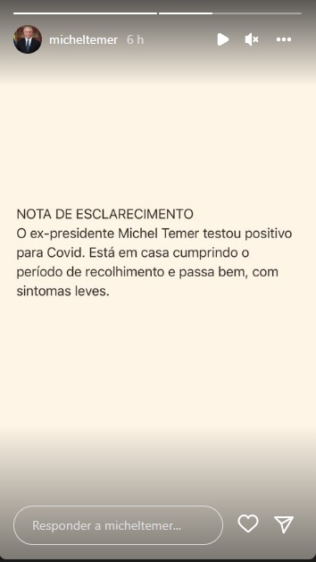 “O ex-presidente Michel Temer testou positivo para Covid. Está em casa cumprindo o período de recolhimento e passa bem, com sintomas leves“, anunciou a equipe de Temer nas redes sociais.
