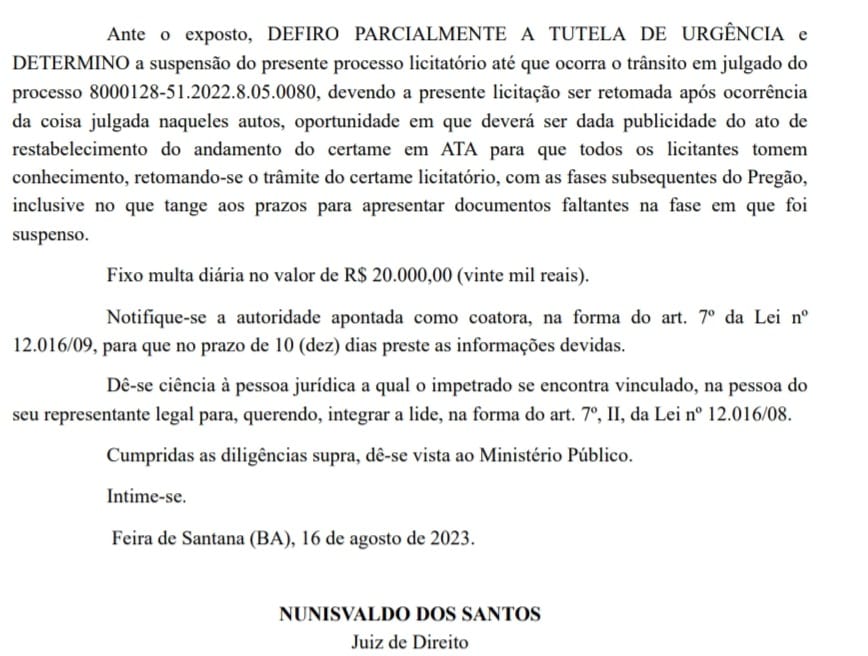 O Tribunal de Justiça da Bahia (TJ-BA) determinou um prazo de 10 dias para que a Prefeitura de Feira de Santana anule o resultado da licitação que prevê a contratação de empresa especializada na prestação de serviços de apoio com nível técnico na área de saúde, cuja empresa vencedora do certeme foi a Confiança Serviços e Soluções em Mão de Obra Ltda. O recurso foi apresentado pelo Instituto Vida Forte, que também concorria, e acatado pelo juiz Nunisvaldo dos Santos, titular da 2ª Vara da Fazenda Pública.