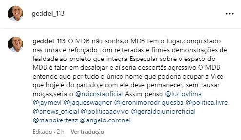 "Especular sobre o espaço do MDB é falar em desalojar e aí seria descortês, agressivo. O MDB entende que, por tudo, o único nome que poderia ocupar a vice que hoje é do partido, e com ele deve permanecer, sem causar moças, seria o Rui Costa", postou.