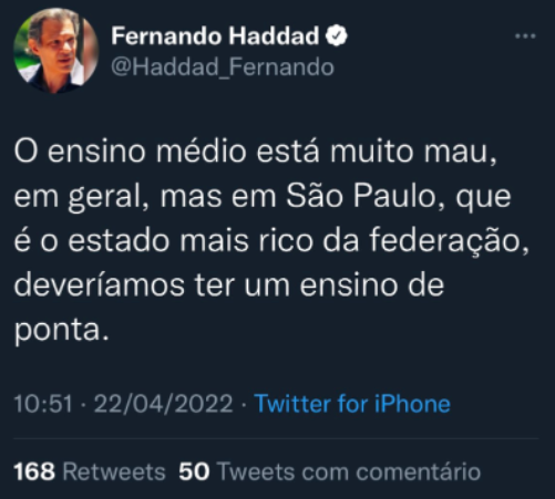 Na última sexta-feira (22), Fernando Haddad usou o Twitter para criticar o ensino médio no estado de São Paulo. A publicação do professor petista, que foi ministro da Educação no governo Lula, chamou a atenção por causa de um erro de gramática, e acabou sendo apagado depois. “O ensino médio está muito mau, em geral, mas em São Paulo, que é o estado mais rico da federação, deveríamos ter um ensino de ponta”, escreveu Haddad, usando o adjetivo “mau”, quando deveria ter usado o advérbio “mal”. Após perceber o erro gramatical, Haddad apagou a publicação.