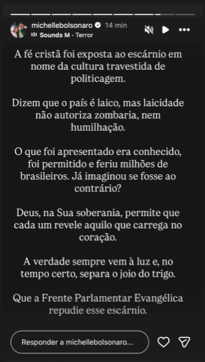 “A fé cristã foi exposta ao escárnio em nome da cultura travestida de politicagem. Dizem que o país é laico, mas laicidade não autoriza zombaria, nem humilhação”, escreveu Michelle no Instagram.