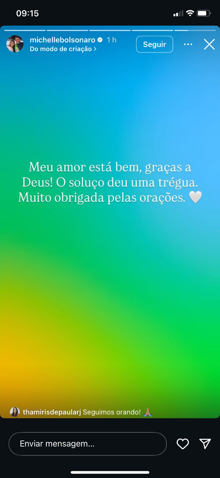 Meu amor está bem, graças a Deus! O soluço deu uma trégua. Muito obrigada pelas orações!" , escreveu no story do Instagram.