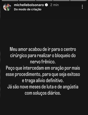 “Meu amor acabou de ir para o centro cirúrgico para realizar o bloqueio do nervo frênico. Peço que intercedam em oração por mais esse procedimento, para que seja exitoso e traga alívio definitivo. Já são nove meses de luta e de angústia com soluços diários”, afirmou Michelle nas redes sociais.