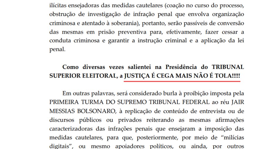 No documento publicado no portal oficial do STF divulgada nesta quinta-feira (24), há um trecho que Moraes foi dar uma bronca em Bolsonaro e diz que caso haja a constatação de produção de conteúdo para as redes sociais — proibida pelas medidas impostas —, Bolsonaro estará passível à prisão preventiva.