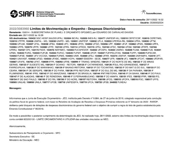 A denúncia foi feita pela União Nacional dos Estudantes (UNE), a Associação Nacional de Pós-Graduandos (ANPG) e a Associação Nacional dos Dirigentes das Instituições Federais de Ensino Superior (Andifes), que divulgaram em suas redes sociais uma imagem de comunicado do Sistema Integrado de Administração Financeira do Governo Federal (Siafi), do Tesouro Nacional. O documento é assinado pela Subsecretaria de Planejamento e Orçamento (SPO), pela Secretaria Executiva (SE) e pelo Ministério da Educação (MEC).
