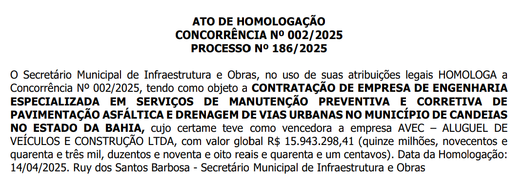 A Prefeitura de Candeias, atualmente comandada por Eriton Ramos (PP), homologou nesta segunda-feira (14) a concorrência para a "contratação de empresa de engenharia especializada em serviços de manutenção preventiva e corretiva de pavimentação asfáltica e drenagem de vias urbanas no município de Candeias no Estado da Bahia".