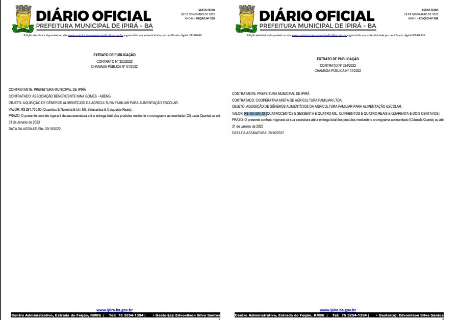 A prefeitura de Ipirá, cidade a 161 km de Salvador, fechou um contrato, sem concorrência, em novembro, para a aquisição de gêneros alimentícios da Agricultura Familiar para alimentação escolar, com duas empresas que atuam no setor: a Cooperativa Mista de Agricultura Familiar LTDA (COMAF) e a Associação Beneficente Nina Gomes (Abeng), essa última presidida por uma ex-candidata a vereadora do município cassada por fraude na cota de gênero em 2020.