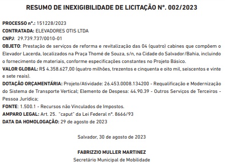 A Prefeitura de Salvador firmou um contrato milionário para a reforma do Elevador Lacerda. A informação foi publicada no Diário Oficial do Município nesta semana (veja abaixo).