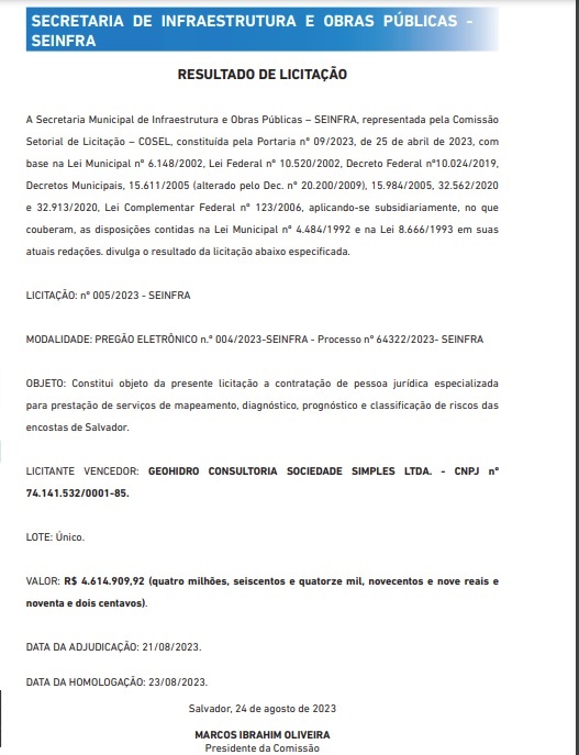 A empresa contratada foi a Geohidro Consultoria Sociedade Simples Ltda, pelo valor total de R$ 4.614.909,92. Na publicação, o resultado da licitação, via pregão eletrônico, consiste à empresa o objetivo de prestar serviços de mapeamento, diagnóstico, prognóstico e classificação de riscos das encostas de Salvador.
