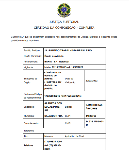 O diretório do PTB na Bahia foi inativado pela Justiça Eleitoral, a pedido da Executiva nacional da sigla. O BNews tentou entrar em contato com o presidente do PTB-BA, Gean Prates, mas até o momento da publicação não obteve resposta.