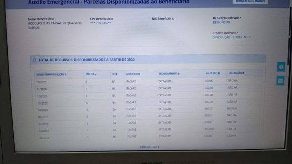Informações disponíveis no Portal da Transferência do Governo Federal dão conta de que o vereador Rodolfo Elias Carvalho Quadros Barros, vice-presidente da Câmara de Vereadores de Itacaré, recebeu cerca de R$ 6.9 mil do Programa Auxílio Emergencial.