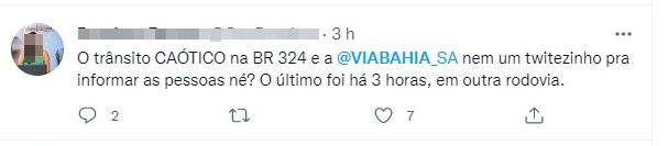 "O trânsito CAÓTICO na BR 324 e a @VIABAHIA_SA nem um twitezinho pra informar as pessoas né? O último foi há 3 horas, em outra rodovia", escreveu uma internauta.