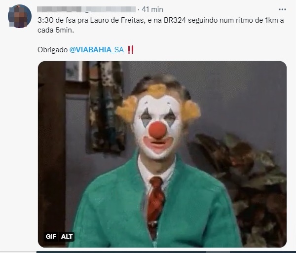 "3:30 de fsa pra Lauro de Freitas, e na BR324 seguindo num ritmo de 1km a cada 5min. Obrigado @VIABAHIA_SA‼️", publicou outro.