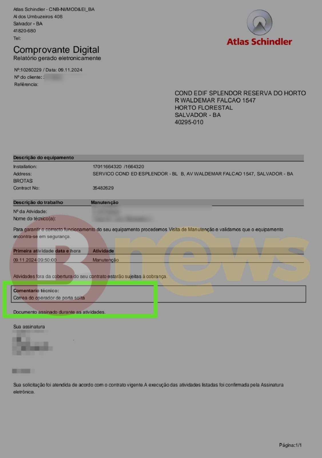 Um laudo emitido pela empresa Atlas Schindler mostra que o elevador que despencou no Edifício Splendor, no bairro do Horto Florestal, em Salvador, na quinta-feira (14), apresentava “correa do operador de porta solta”. O documento foi disponibilizado em nove de novembro, quase uma semana antes do acidente que vitimou duas pessoas.