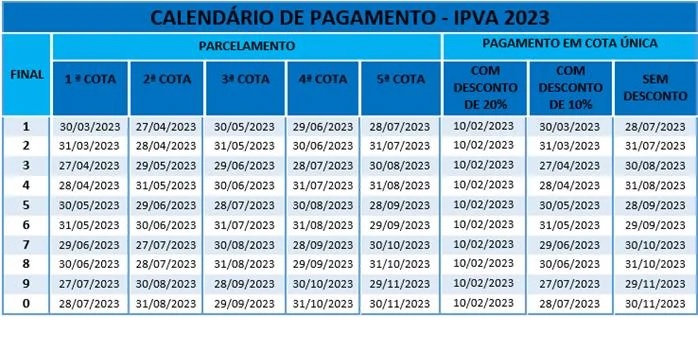 A quitação integral do IPVA com 10% de desconto pode ser feita na primeira cota do parcelamento, cuja data varia de acordo com o número final da placa do veículo. Parcelar o imposto em cinco vezes é outra opção para os proprietários de veículos, que só precisam observar a data de vencimento da primeira cota na tabela, de acordo com o número final da placa. Para parcelar, é preciso que o valor devido seja no mínimo R$ 120,00. Os débitos referentes à taxa de licenciamento e às multas de trânsito deverão ser pagos até a data de vencimento da quinta parcela. O proprietário que perder o prazo da primeira cota deixa de ter direito ao parcelamento em cinco vezes.